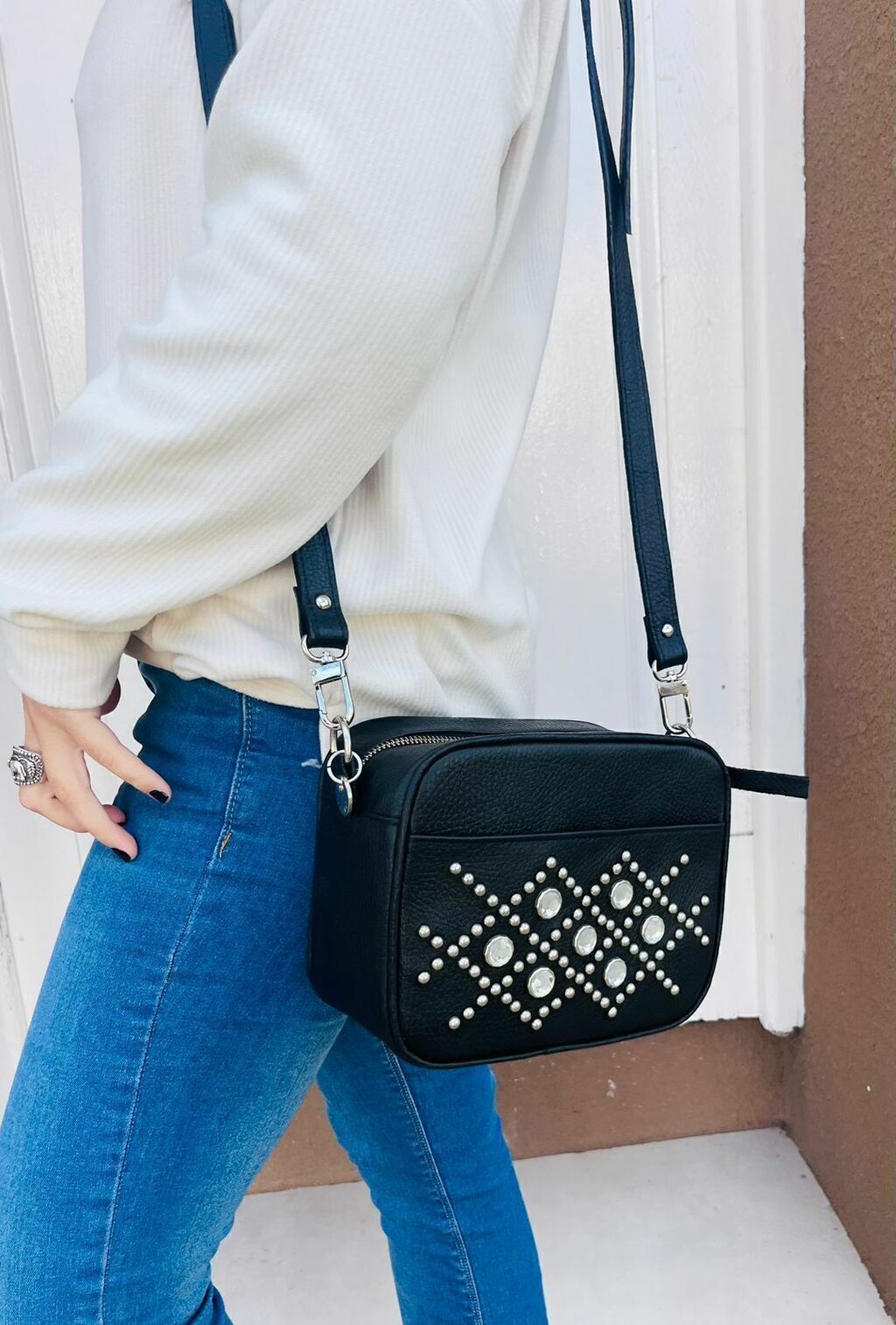 Cartera/bandolera con tachas y piedras. Posee bolsillo delantero, un cierre principal y otro pequeño en su interior. Correa desmontable y regulable. Un modelo delicado y fino, ideal para resaltar en cualquier ocasion.